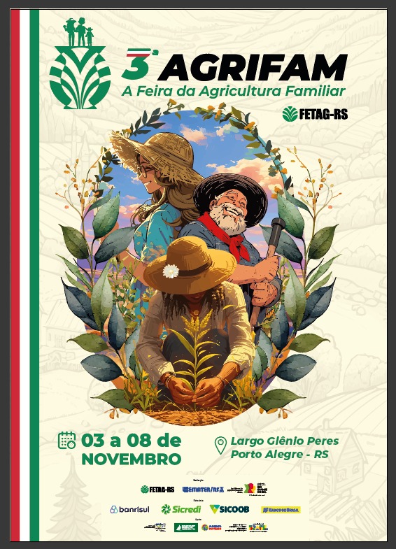 De 3 a 8 de novembro, o Largo Glênio Peres, em Porto Alegre, sediará a 3ª edição da AGRIFAM – Feira da Agricultura Familiar, promovida pela Federação dos Trabalhadores na Agricultura do Rio Grande do Sul (FETAG-RS), com realização conjunta da Emater/RS-Ascar e da Secretaria do Desenvolvimento Rural (SDR), apoio do Ministério do Desenvolvimento Agrário e Agricultura Familiar (MDA), da Prefeitura de Porto Alegre, da Universidade Federal da Fronteira Sul (UFFS) e do programa Alimento no Prato, e patrocínio do Banrisul, Sicredi, Sicoob e Banco do Brasil.