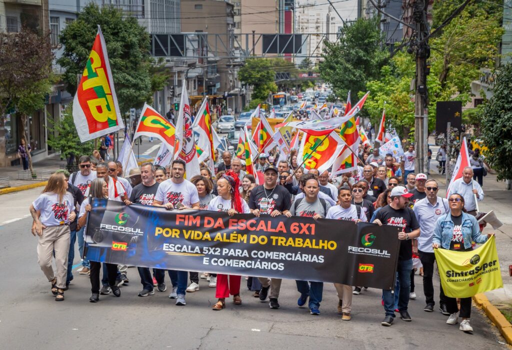 Uma grande caminhada pelas ruas centrais de Caxias do Sul marcou o encerramento do 1º Encontro Nacional dos Trabalhadores e Trabalhadoras do Comércio e Serviços da CTB. Realizado entre os dias 25 e 27 de fevereiro, o encontro reuniu mais de 200 representantes sindicais de todo o Brasil na Serra Gaúcha e consolidou a defesa do fim da escala 6×1 como prioridade nacional da categoria.